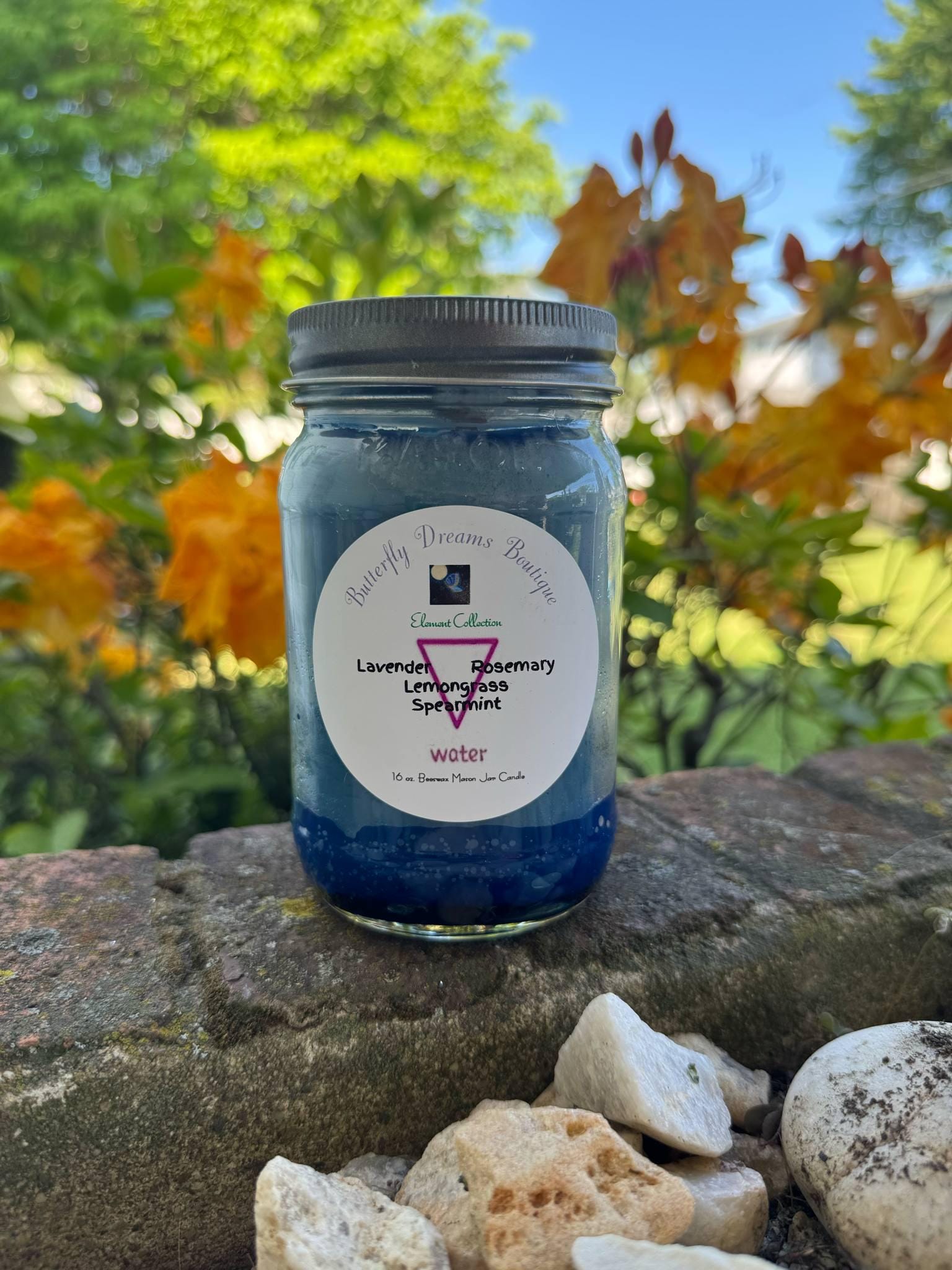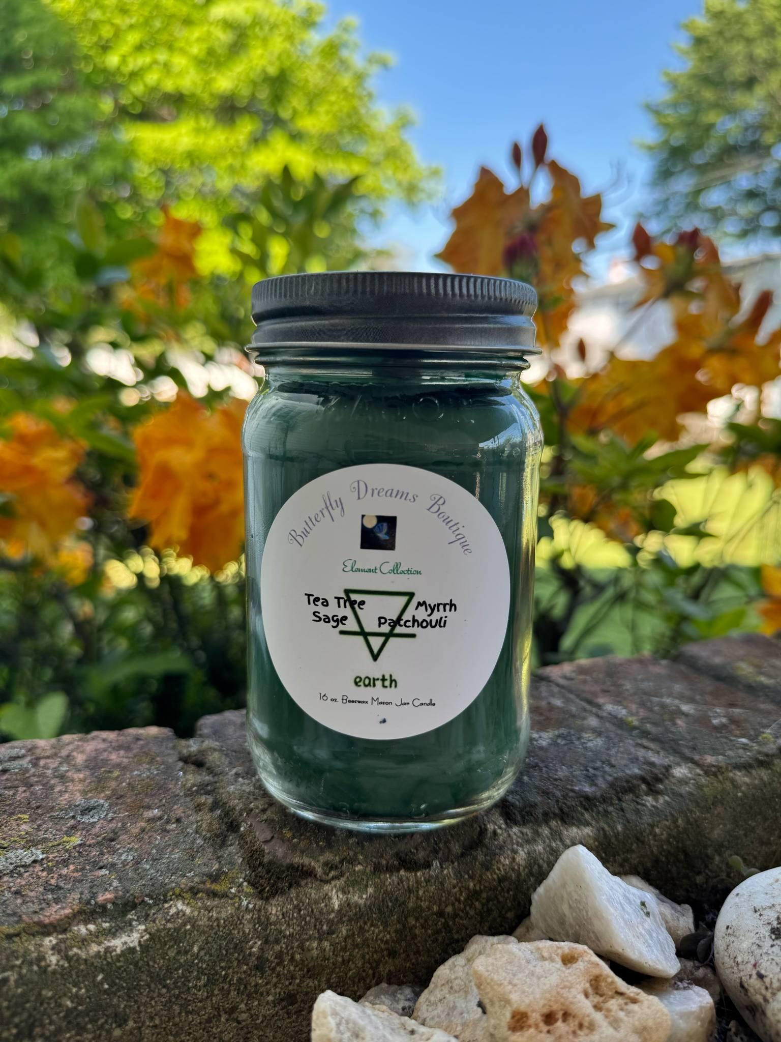 The "All Natural Element Collection" features an 16 oz beeswax jar candle with a wooden wick. Handmade by Butterfly Dreams Boutique, this traditional-style candle is scented with a multi aroma. Perfect for various rooms like the bedroom, kitchen, or porch, this candle burns for 1-2 hours and is ideal for creating a cozy atmosphere with a touch of nature.